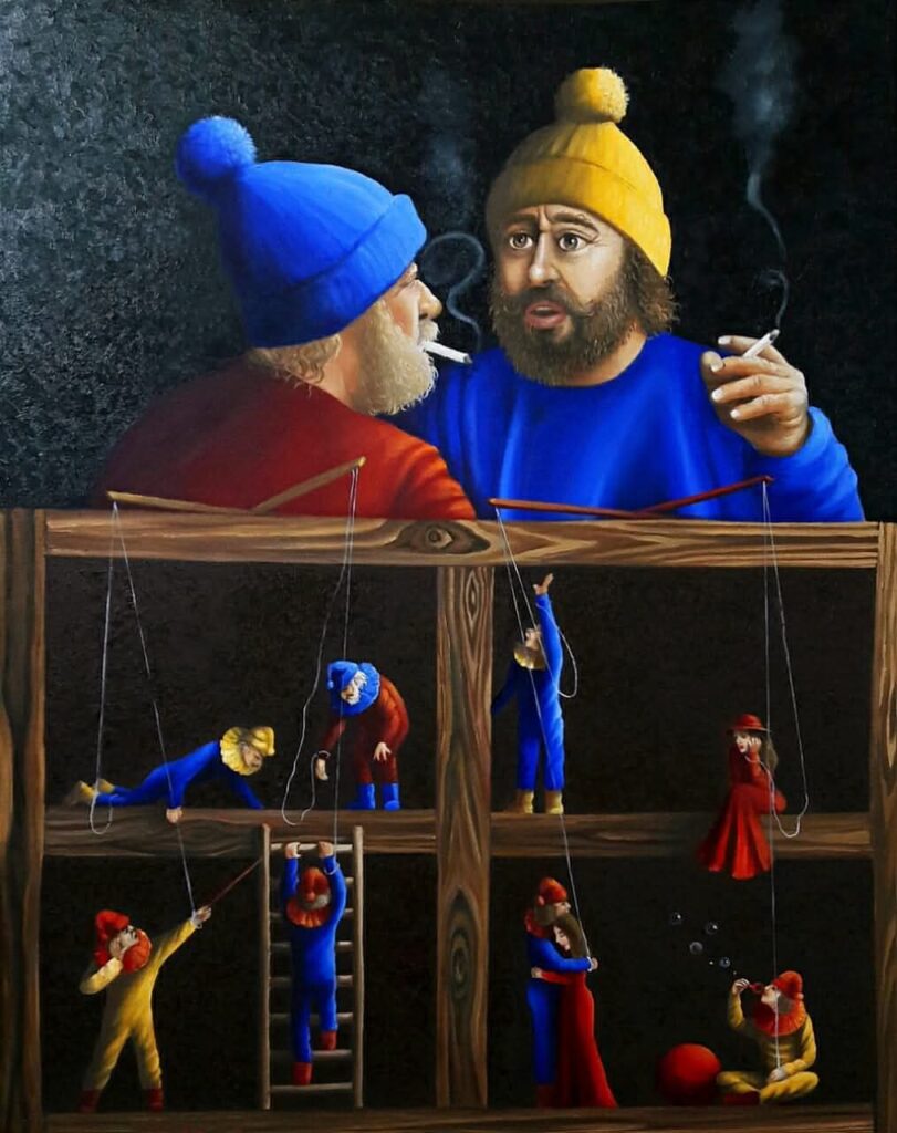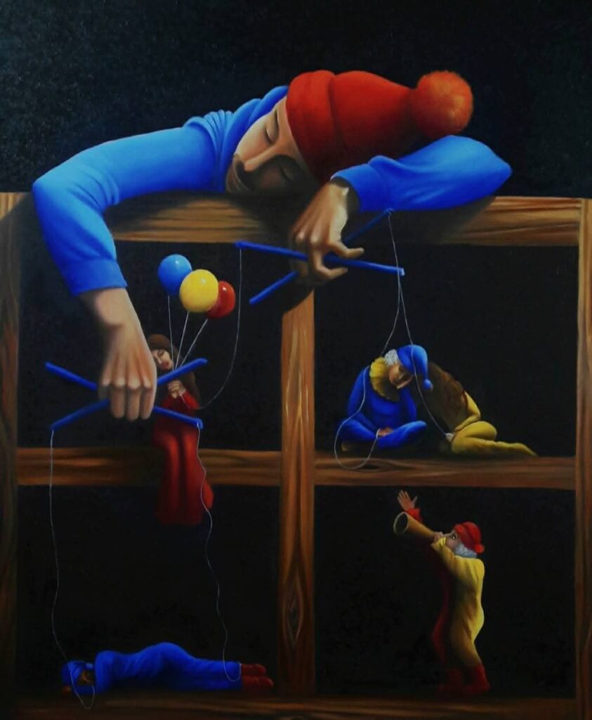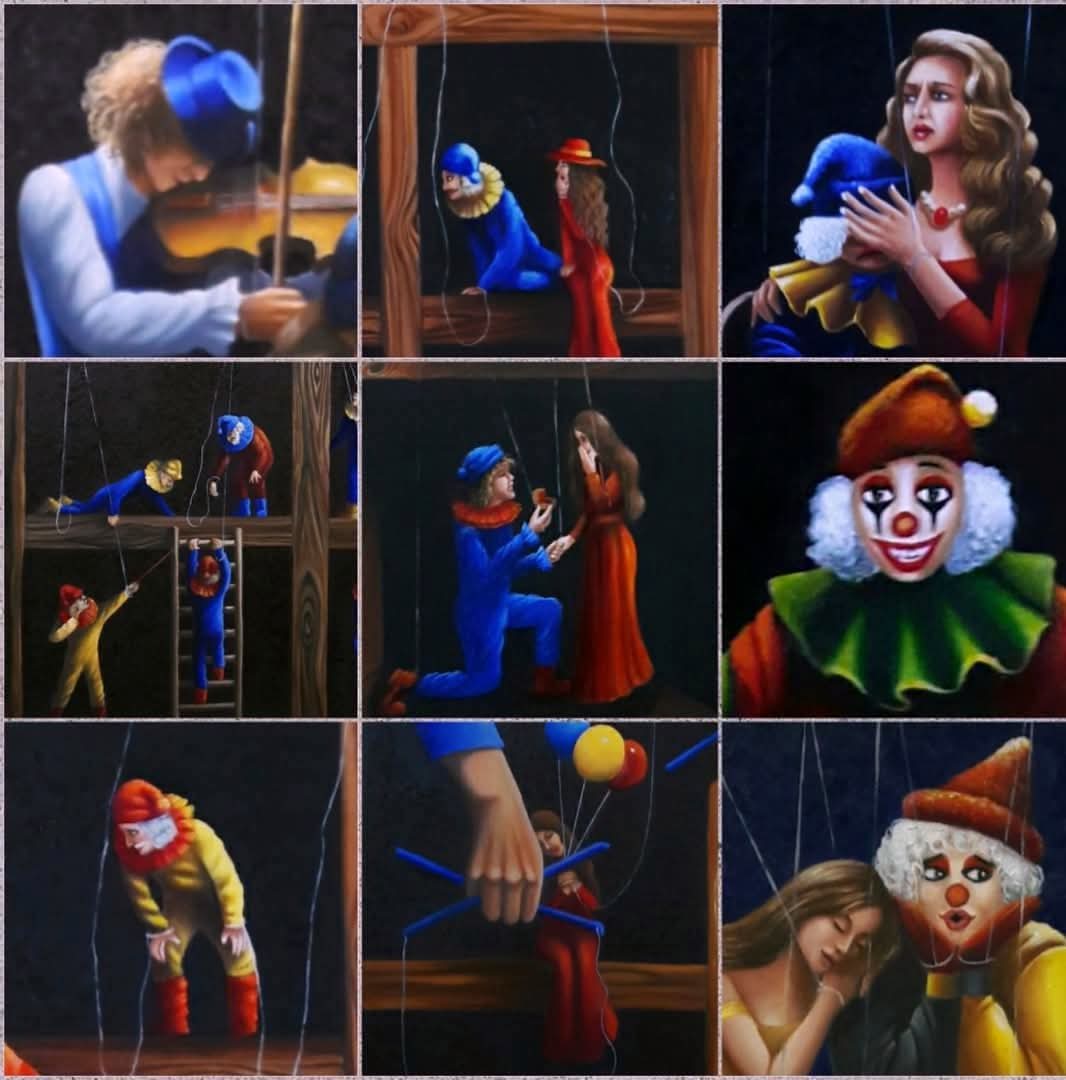 ▪️ في اللوحات المرفقة يظهر المسرح كقدر محكم، وكأن حياة البشر لا تُروى إلا كاستعارة لدمى معلقة بخيوط غير مرئية، تحركها قوة أعلى.. لكن «راميا» تقلب هذه المعادلة بذكاء: