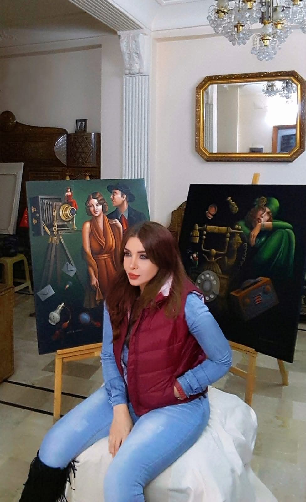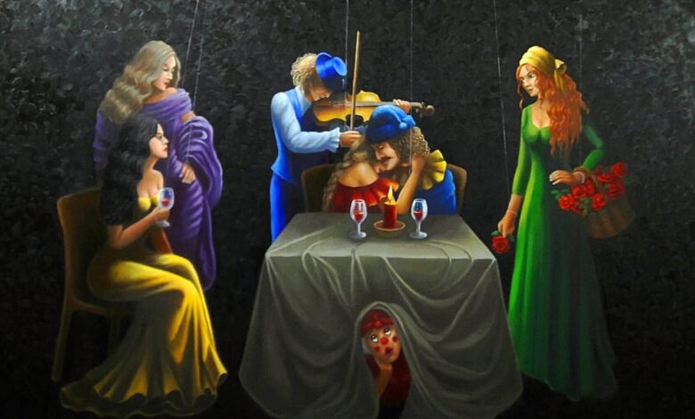▪️ اللافت أن الفنانة تتحرك بخفة بين السيريالية والواقعية، بين السردي والزخرفي، محافظة على حضور المهرج كتوقيع بصري، مع الوضع بالاعتبار أن هذا الحضور ليس مجرد رمز، بل هو مركز ثقل، يعيد ترتيب باقي العناصر ويضمن استمرارية مسارها، حتى في انتقالها إلى عالم «الآرت ديكو» الذي تحاول من خلاله إحياء شكل بصري قديم بروح معاصرة، من دون أن تتخلى عن لغتها الخاصة.